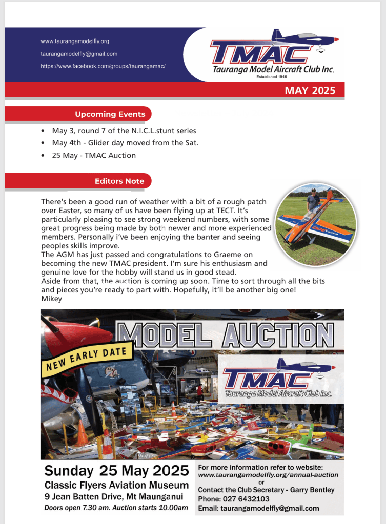 TMAC produces a monthly newsletter, covering items of general interest to the model aviation community, particularly focussed on activities within the Bay of Plenty region.